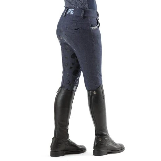Crafted from a denim-look cotton blend, these kids breeches offer an on-trend look with superior riding performance. The full seat of intricate, patterned heavyweight gel helps to provide a secure seat, while two traditional front scoop pockets lined with glitter detailing adorn the front of this breech. The My First Ride print runs down the outer leg for a unique look. PE branding on the waistband and shimmering glitter detailing give these kids breeches a glamorous touch.