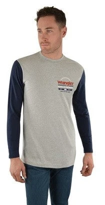 Long-sleeve tee perfect for the entire year, tiny front chest Wrangler logo print with huge rear feature print, 2 Tone panel tee with contrast sleeves, rib neckband.